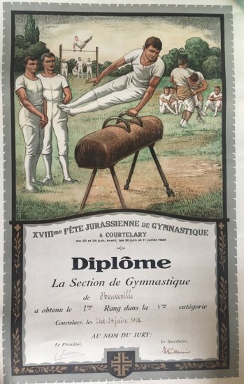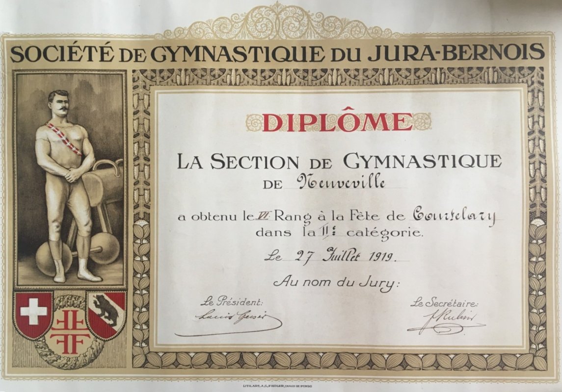 Ces diplômes, attestant les performances de la section de gymnastiques de la Neuveville lors de divers concours, datent d'il y a environ un siècle ! Ils sont les plus anciens prix retrouvés à ce jour qui ont été obtenus par la société.